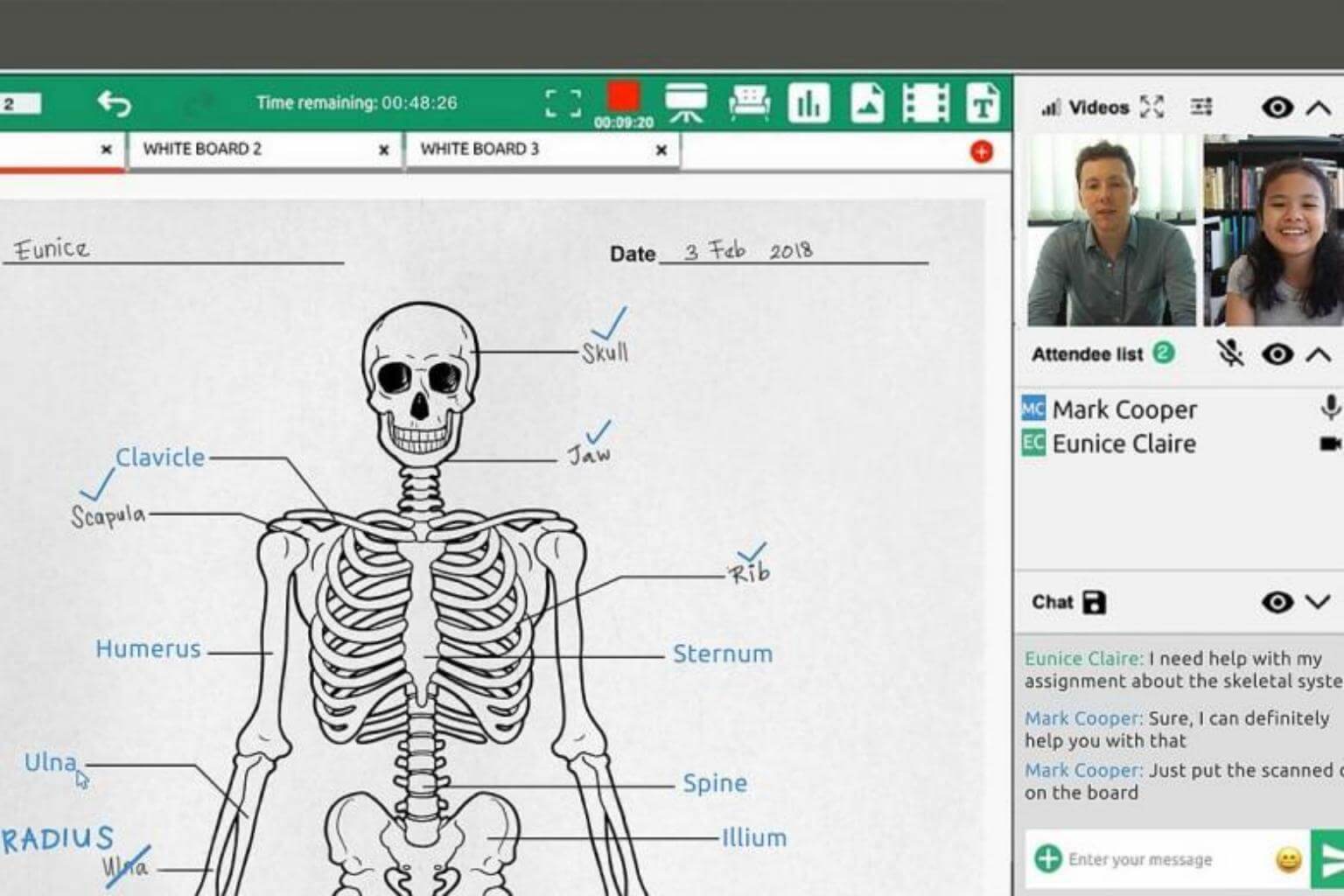 A live lesson on the teachnlearn platform, which includes a virtual whiteboard, video chat, messaging and replay functions.