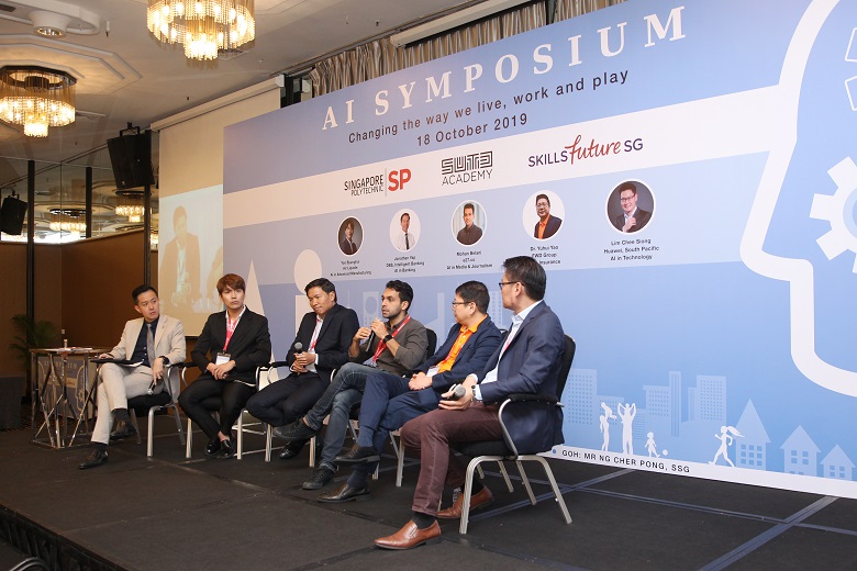 Speakers at a panel discussion during the inaugural Singapore Polytechnic Artificial Intelligence Symposium held at the Concorde Hotel on Oct 18, 2019.