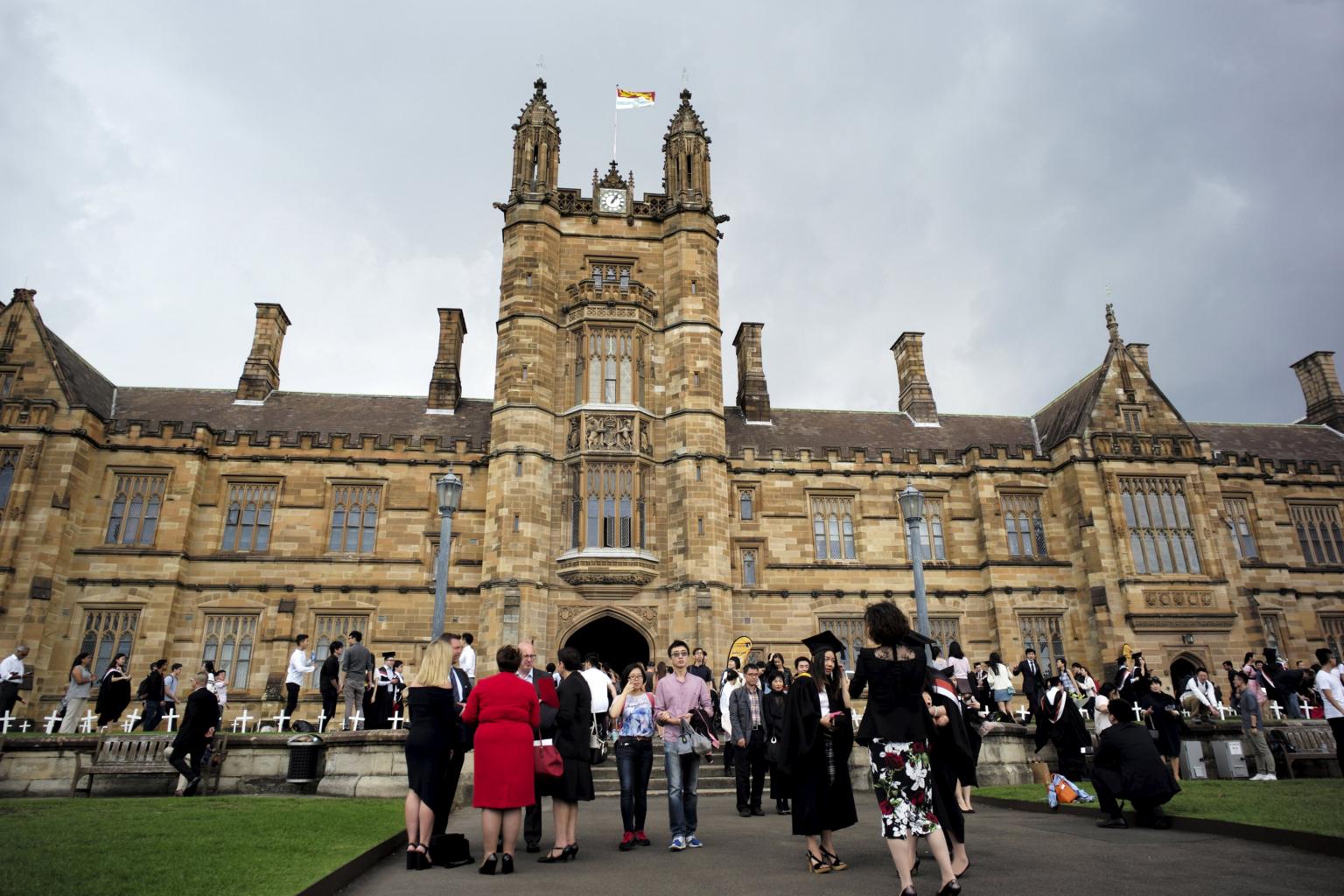 University students walk on the campus of University of Sydney following a graduation ceremony in Sydney, Australia.