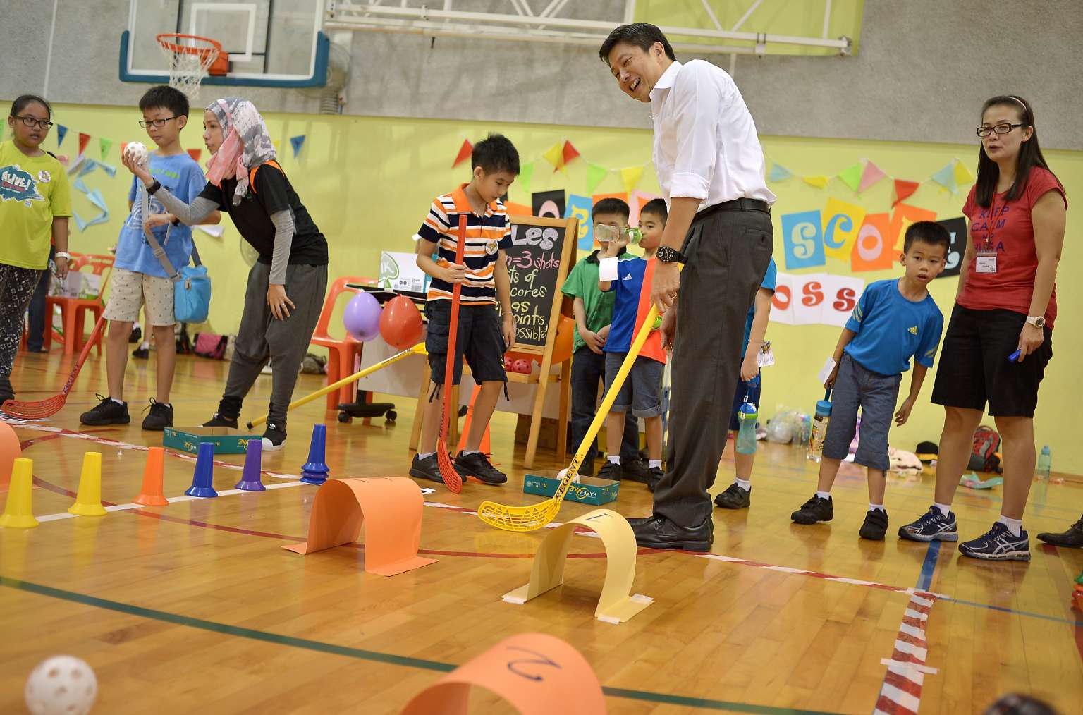 Acting Minister for Education Ng Chee Meng trying a game organised by pupils from Frontier Primary’s Red Cross CCA on Oct 8, 2015.