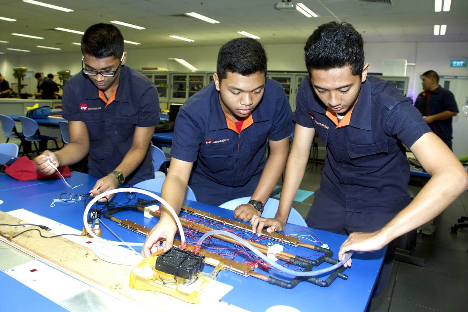 ITE College West students (from left) Izzat Mahad, Mohd Asyraf Mohd Zailani and Ahmad Irfan Muhd Sharif doing a project which transform heat energy into electrical energy to activate a cooling system which will make the roads less hot.
