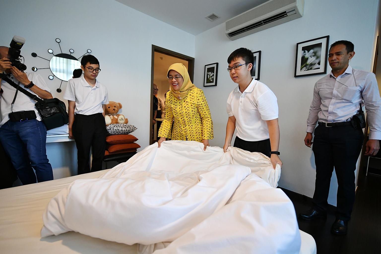 Student Sum Joon Ho Gabriel folding a duvet with President Halimah Yacob at the Housekeeping Training Room. He is a year one student doing ISC (ITE Skills Certificate) in Housekeeping Operations (Accommodation).