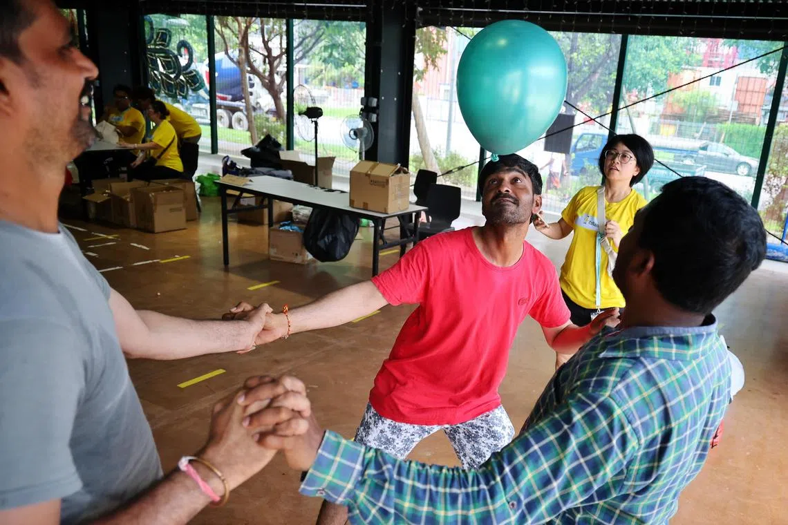 Migrant workers playing a game at The Big Potluck event organised by charity group ItsRainingRaincoats at Tuas South Recreation Centre on June 23.