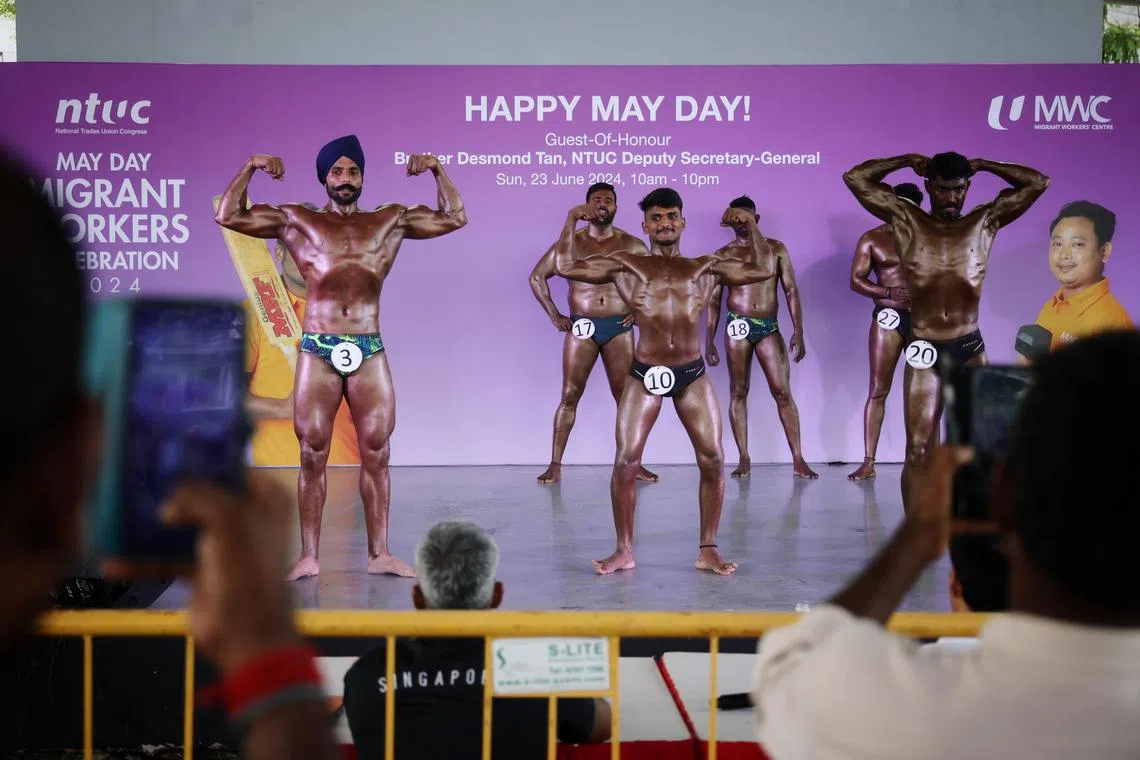 Migrant workers taking part in a bodybuilding competition during the annual NTUC May Day Migrant Workers’ Celebration on June 23.