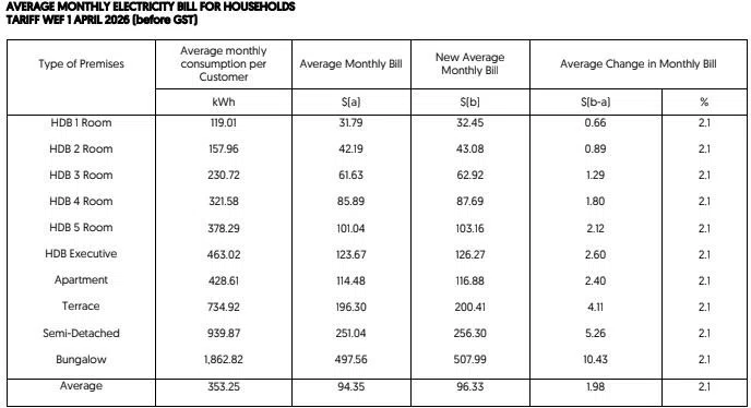 The average monthly electricity bill for those living in four-room HDB flats will increase by $1.96.