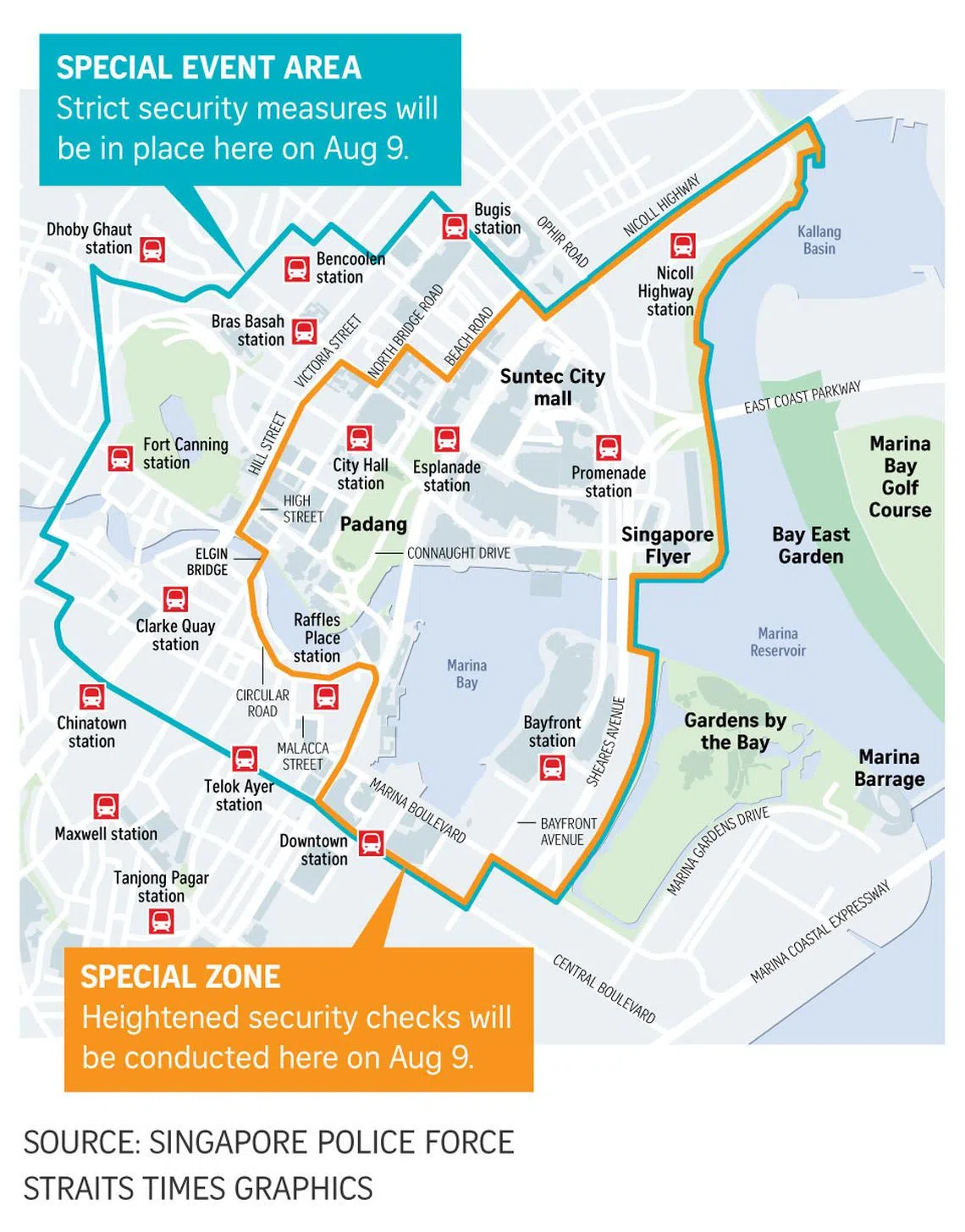 Measures in the area, which has been marked as a special event zone, will include checks on individuals to ensure that banned items do not enter the zone, police said on Aug 2.