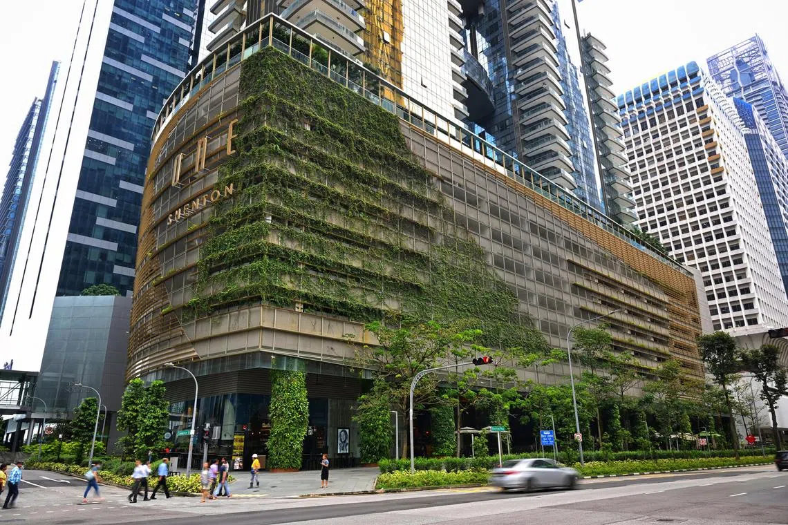 At One Shenton, three-leafed wild vines and cat claw ivy, plants that thrive under strong light, cover its facade.