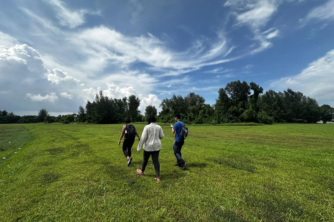 The ST Podcast team along with host Shabana and Mr Lester Tan walking a path new to Marina East Dr.