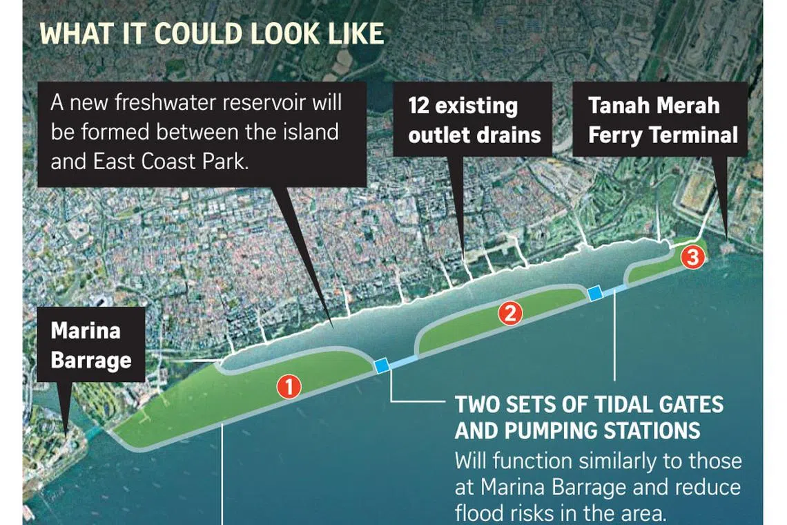To prevent this reality, there are plans to have a defence offshore. That is Long Island, twice the size of Marina Bay reclaimed off the east coast, with a reservoir in between.
