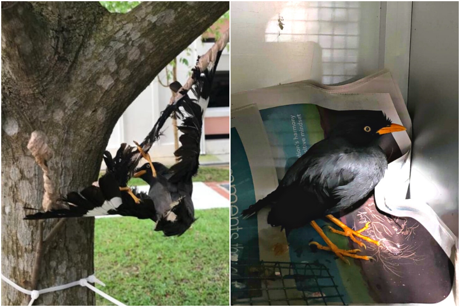 Mr Kalai Vanan Balakrishnan, 35, co-chief executive of Acres who was at the scene, told The Straits Times: "To our horror, the bird, a white vented mynah, had its feet and wings glued to a twig. The twig was cable-tied to a tree.