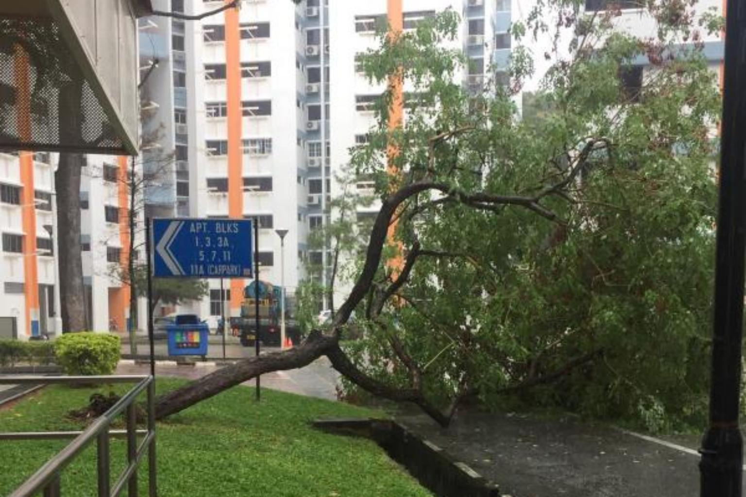The incident comes after an eight-storey tree toppled onto Block 97 Jalan Dua early on Wednesday morning. About 20 units up to the eighth storey were affected, while a pavilion at the foot of the block had its roof crushed.