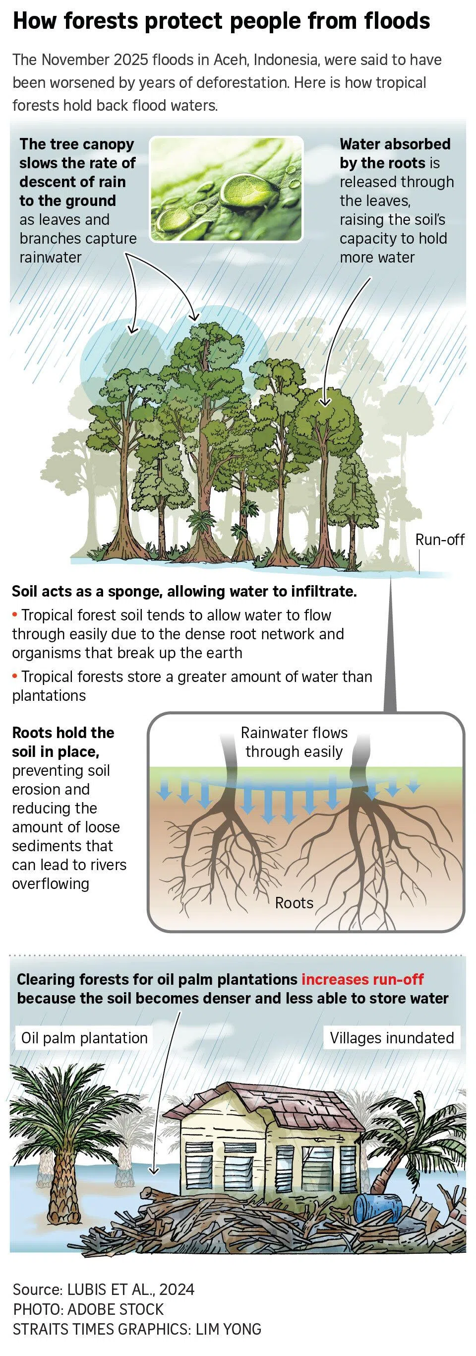 - An NTU study led by Dr Lubis (PLOS One) found flood-prone Aceh areas had fewer trees, more palm oil, and higher poverty, with over 2,000 floods between 2011-2018.