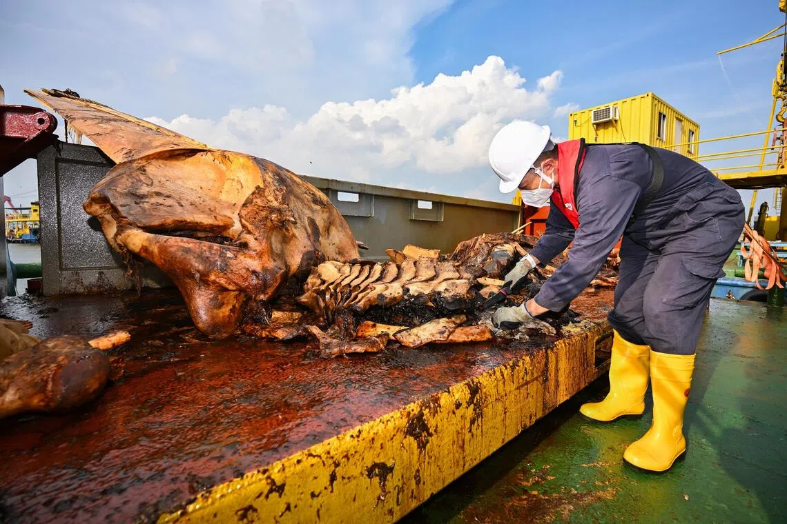 He revealed the findings to the media on Sept 26 at the Singapore Salvage Engineers’ (SSE) shipyard in Tuas, where the putrid carcass had been towed for processing on a barge.