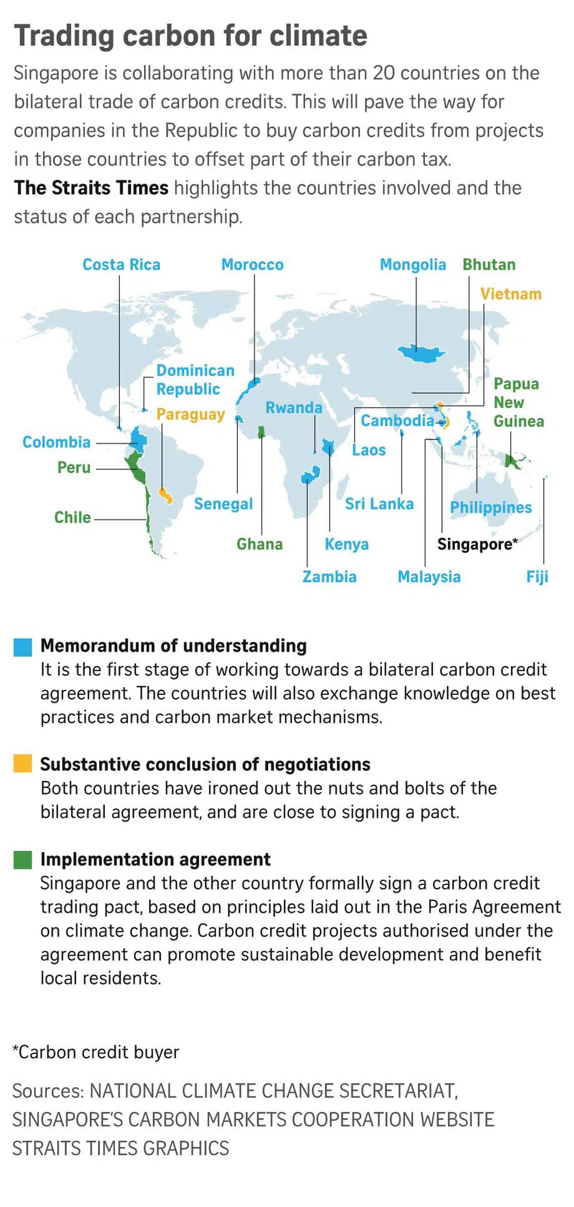 Singapore is also progressing in carbon trading negotiations with more than 15 other countries including Malaysia, Cambodia and Colombia.