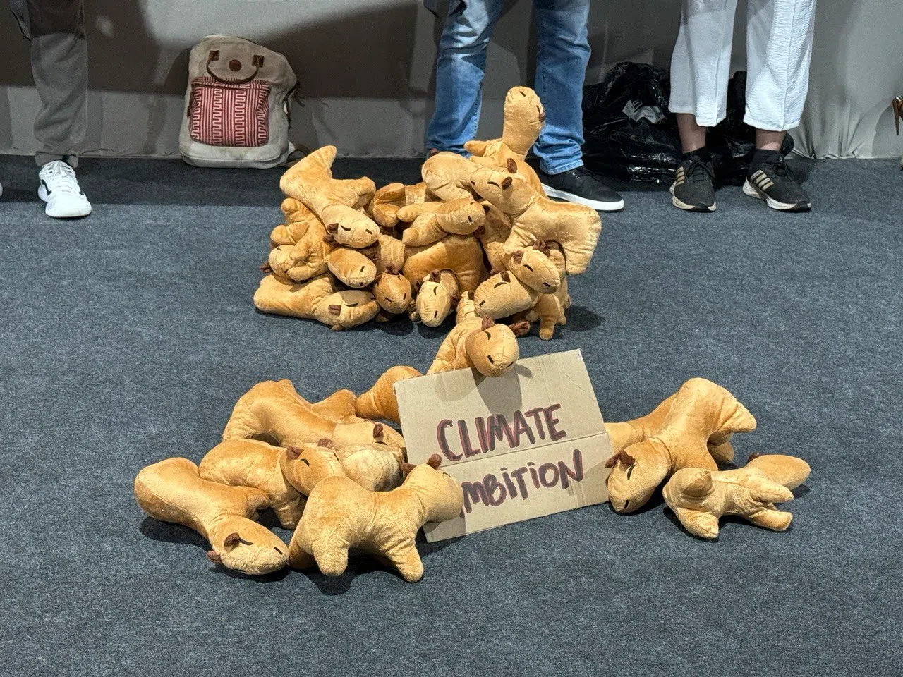 On Nov 20, activists outside the meeting rooms used dozens of stuffed capybaras to call for a fossil fuel free future.