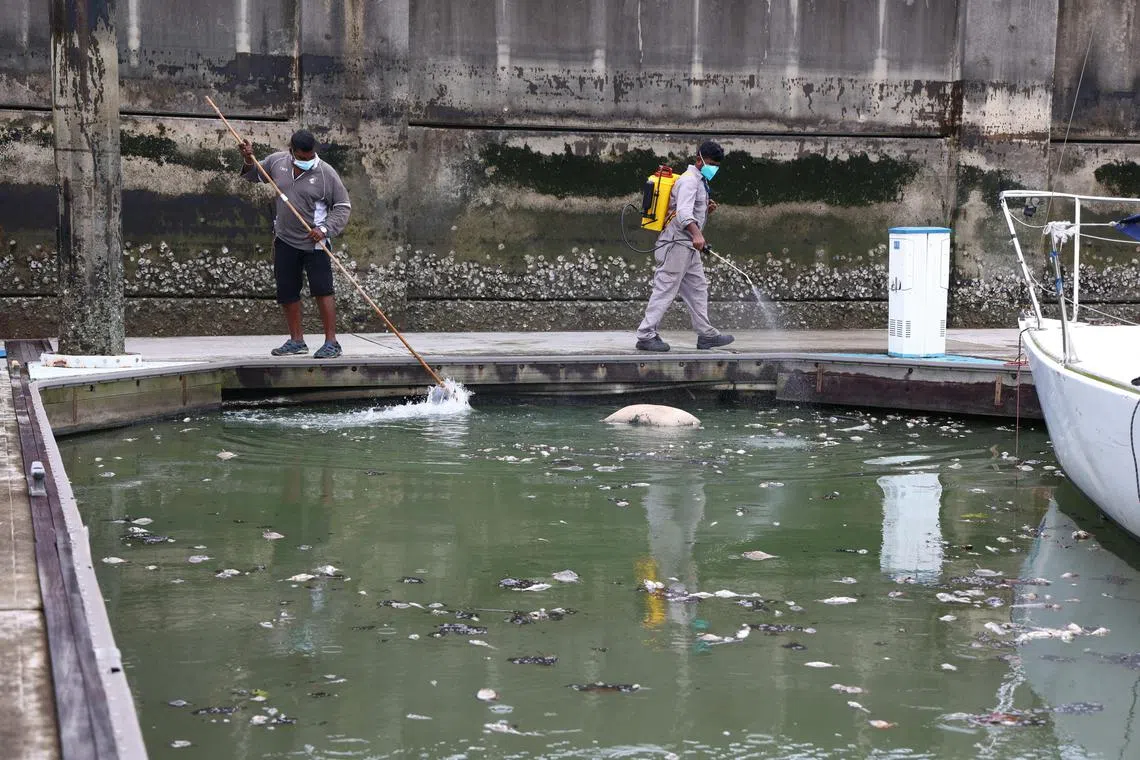 Chinese daily Lianhe Zaobao on Friday published photos showing large numbers of dead fish in the waters off Raffles Marina, a country club in Tuas West Drive. Workers are seen cleaning up.
