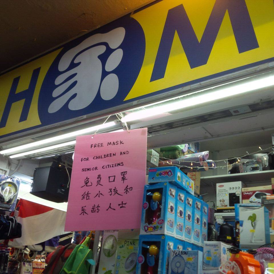 Hardware shop Home in Clementi put up a sign announcing that it was giving away free masks to the elderly and children.