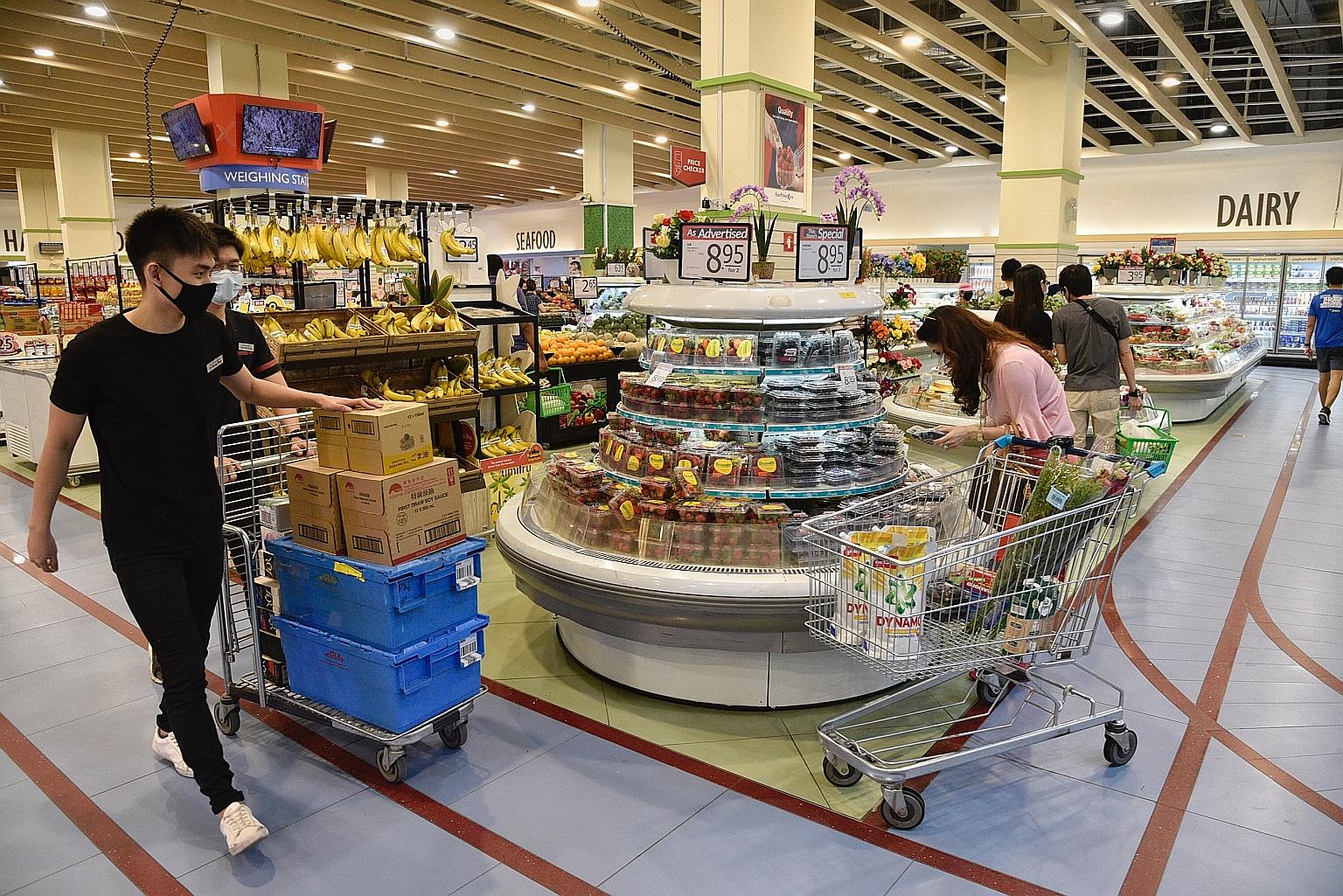 Shoppers at FairPrice Xtra SportHub in Kallang Wave Mall. The importance of food security has been underscored in the ongoing Covid-19 pandemic which has disrupted food supply chains, said Dr Amy Khor, adding that climate change can also impact supply chains.