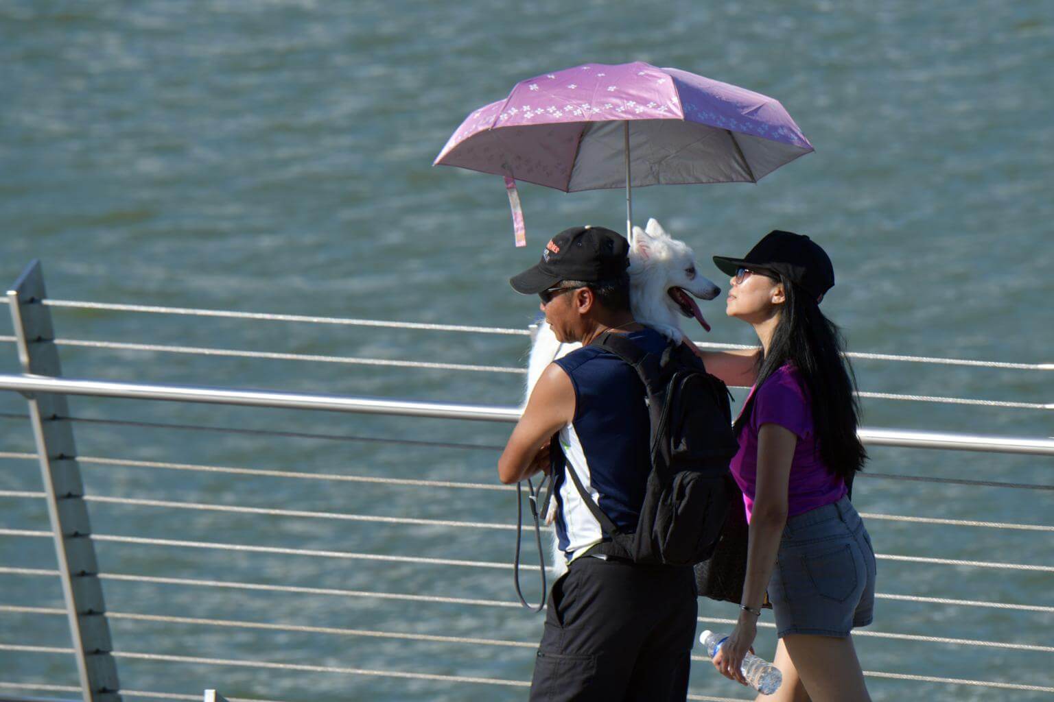 A couple walking on the Jubilee Bridge and shielding their dog from the hot weather.