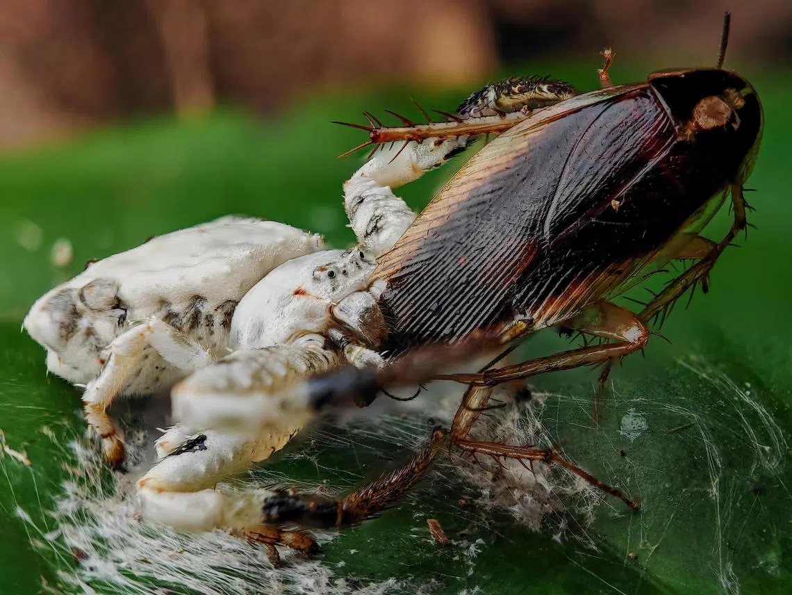 A bird-dropping crab spider (Phrynarachne decipiens) seen eating a cockroach in Singapore.