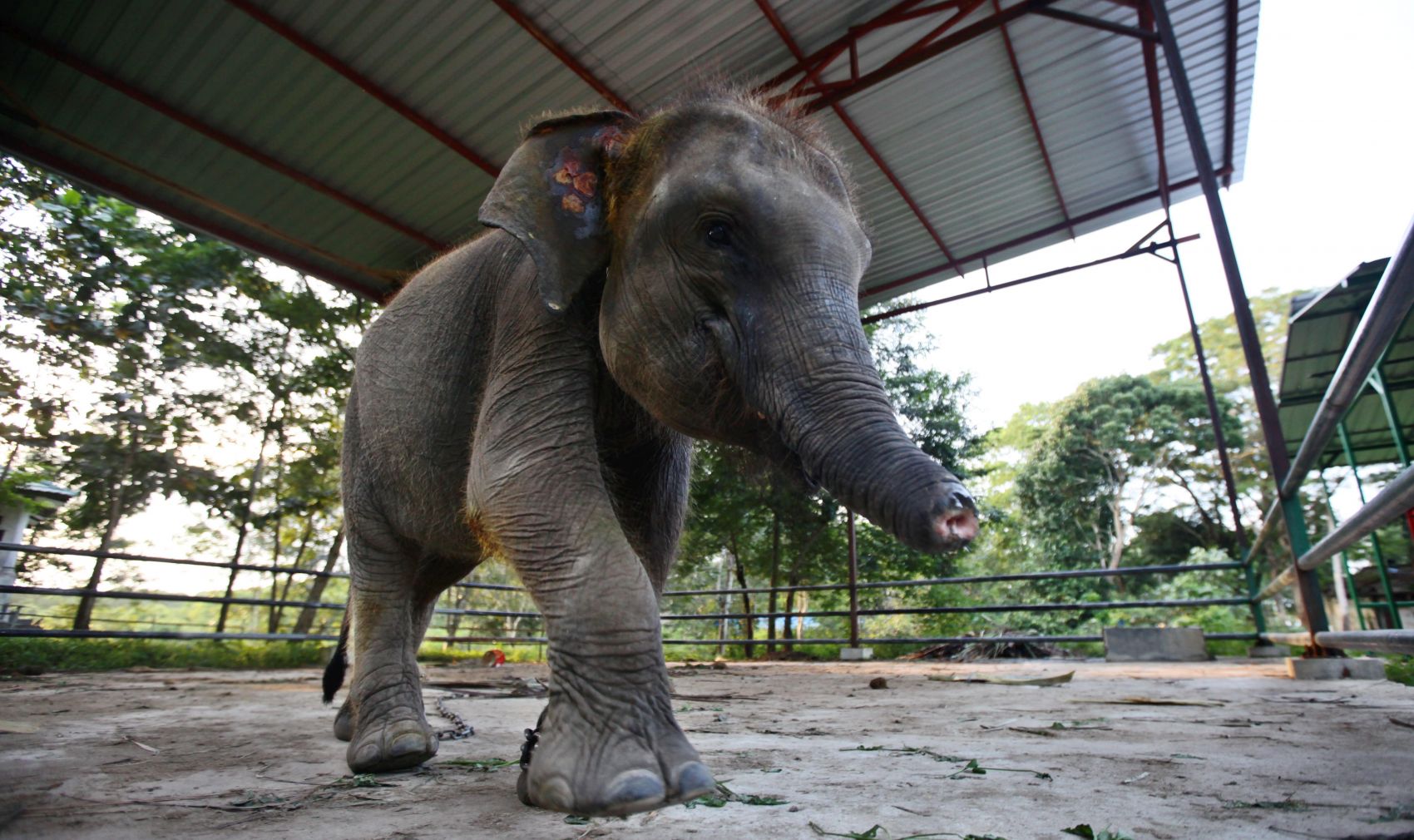 The Sumatran elephant, Erin, was discovered in July 2016 when she was 2 years old, near a housing settlement in Lampung province. Her trunk was severed about 10cm from the distal edge, an injury likely sustained when she fell into a trap.
