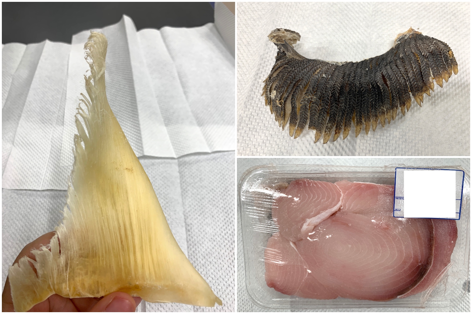 (Clockwise from left) A silky shark labelled as dried shark fin, devil fish labelled as dried gill rakers, bottlenose wedgefish labelled as shovelnose ray meat.