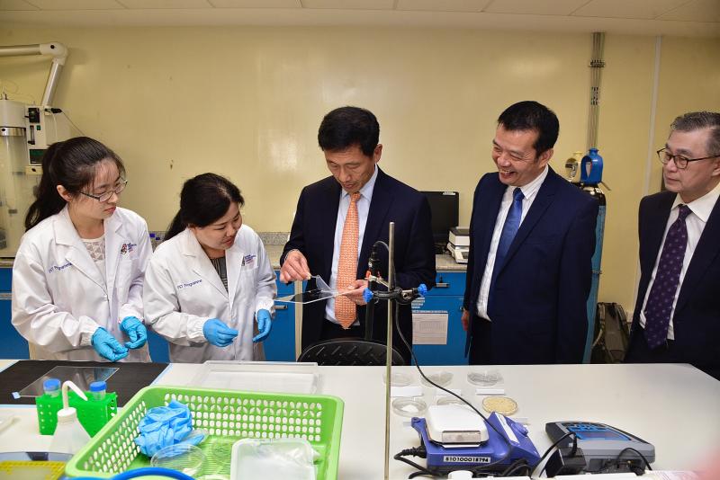 (From left) PhD student Cui Xi with research fellow Zhao Guili look on as Minister for Education, Ong Ye Kung, holds on to a biodegradable packaging film. He is accompanied by Director of Food Science & Technology Programme William Chen and Director and Adviser of Fraser and Neave Limited, Chairman to the Board Executive Committee Koh Poh Tiong.