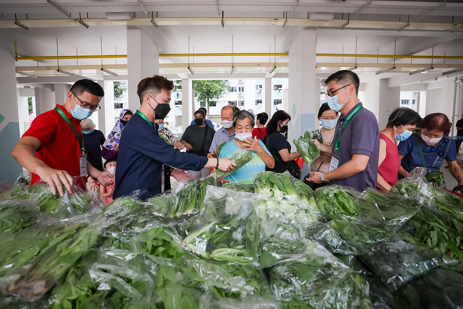 SINGAPORE - Fresh vegetables grown in various community gardens and farms in Ang Mo Kio were distributed on Sunday (July 3) to Cheng San and Seletar residents facing financial difficulties.