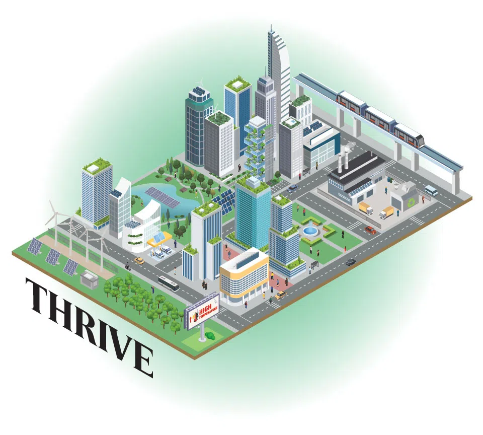Some initiatives include greening a grey building to combat urban heat, maximising solar panel coverage, and weaving mini-forests into urban zones to allow biodiversity to thrive.