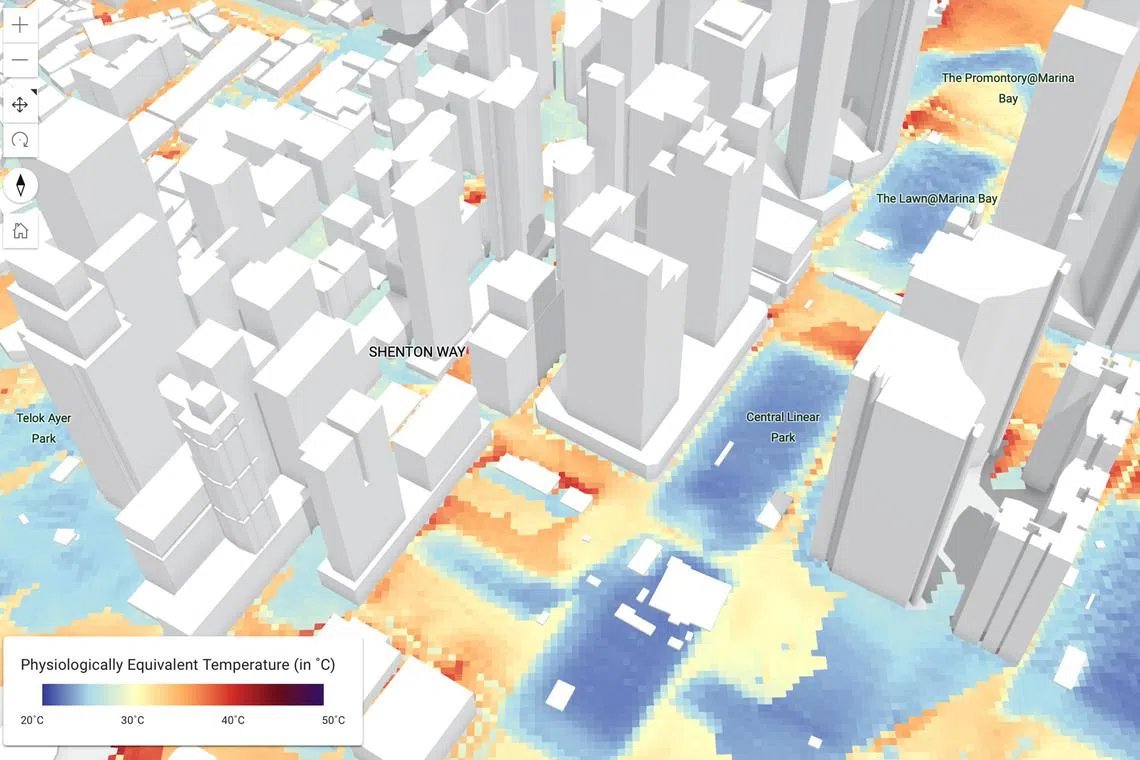 Temperature-related data for a section of the Central Business District, shown through a digital twin created by Cooling Singapore 2.0.