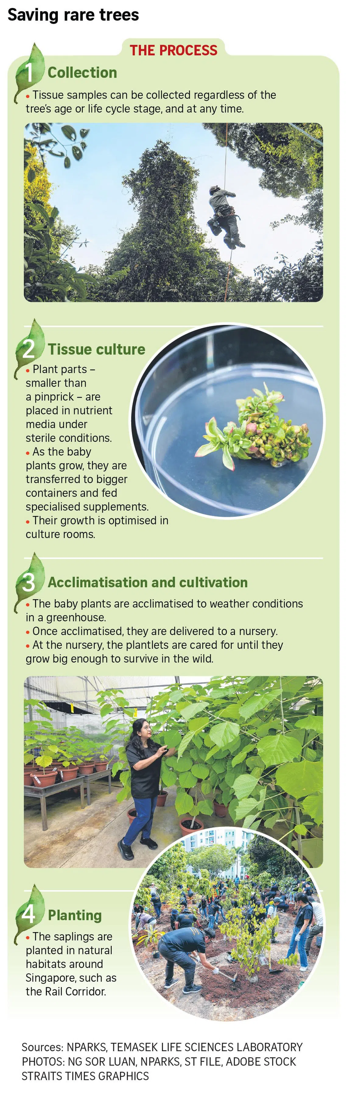 SINGAPORE – In a nondescript building in Kent Ridge, botanists have cracked the code to mass produce clones of critically endangered trees here to aid their fight against extinction.