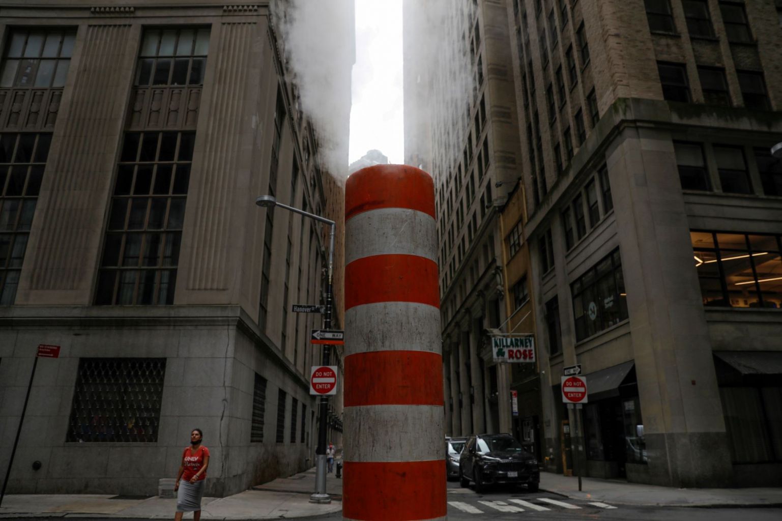 A person walks by a steam pipe in the Financial District after The United Nations released the Intergovernmental Panel on Climate Change's (IPCC) latest report, in Manhattan, New York City.