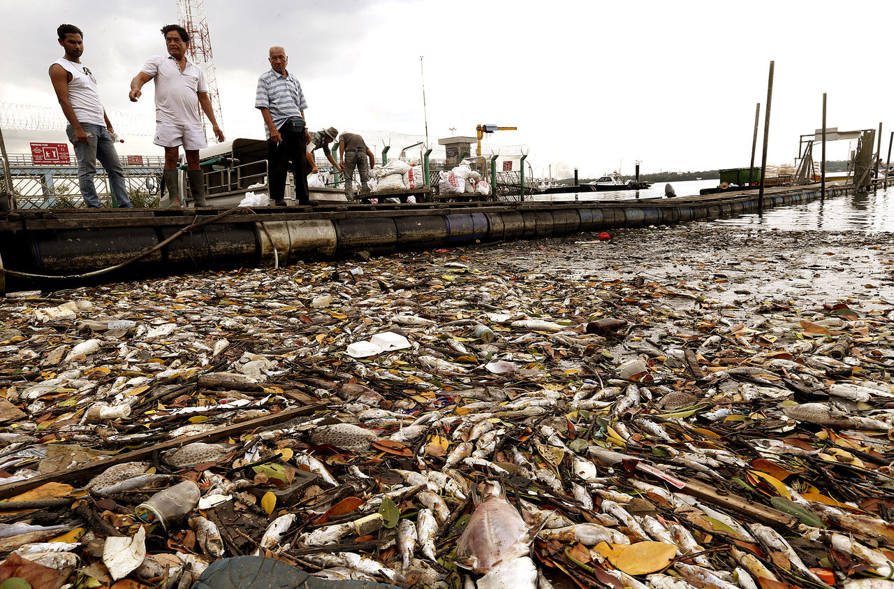 Hundreds of dead fish washed up along the shores of Lim Chu Kang jetty, after a wave of plankton bloom, on March 7, 2015.