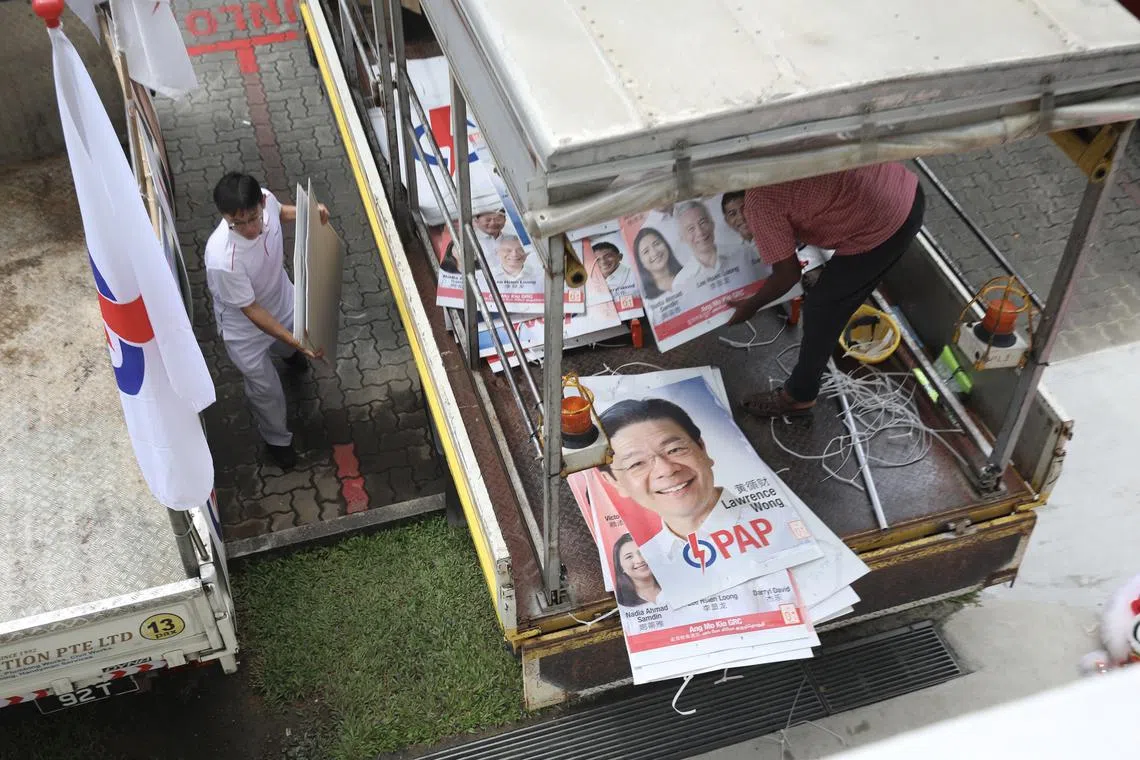 PAP volunteers and workers keeping PAP posters featuring Prime Minister Lawrence Wong and elected candidates in Ang Mo Kio GRC on May 4.