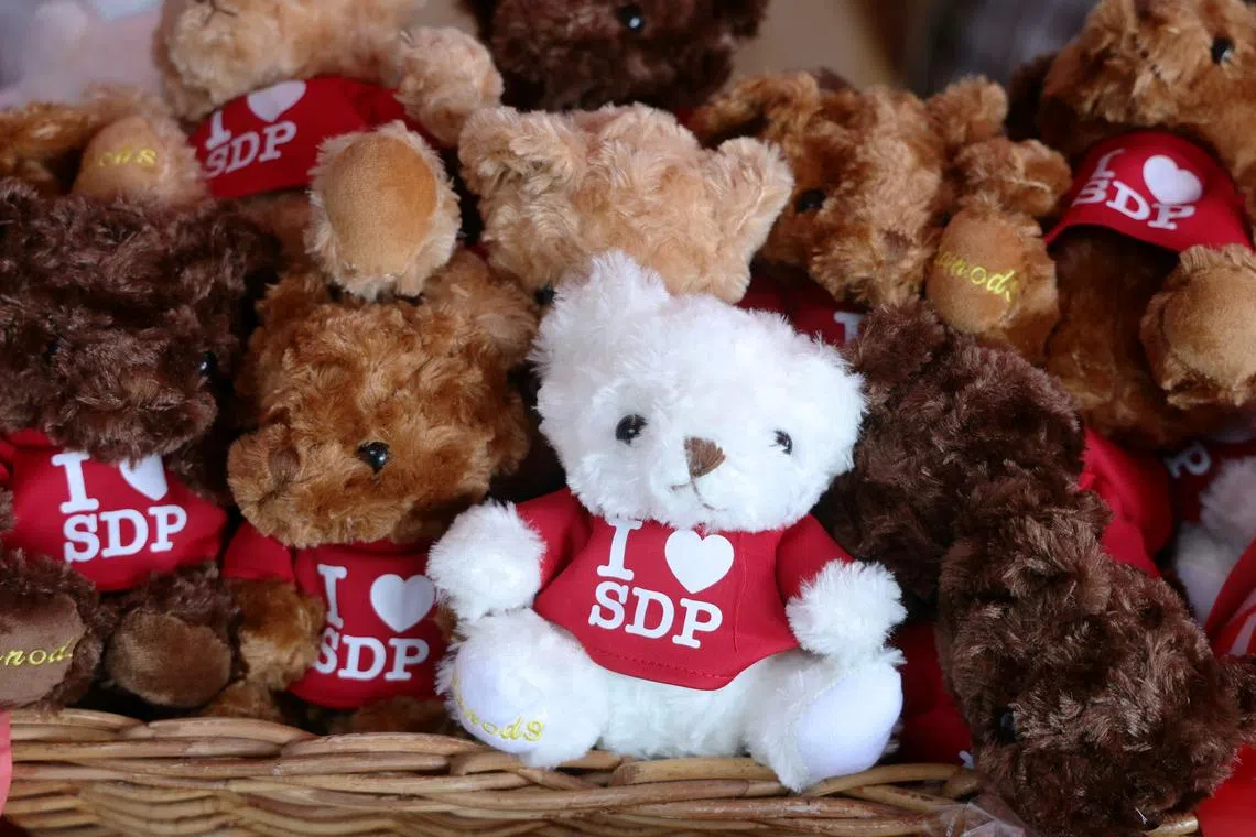 SDP bear plushies on sale during an SDP lunchtime rally at the promenade next to UOB Plaza on April 29.