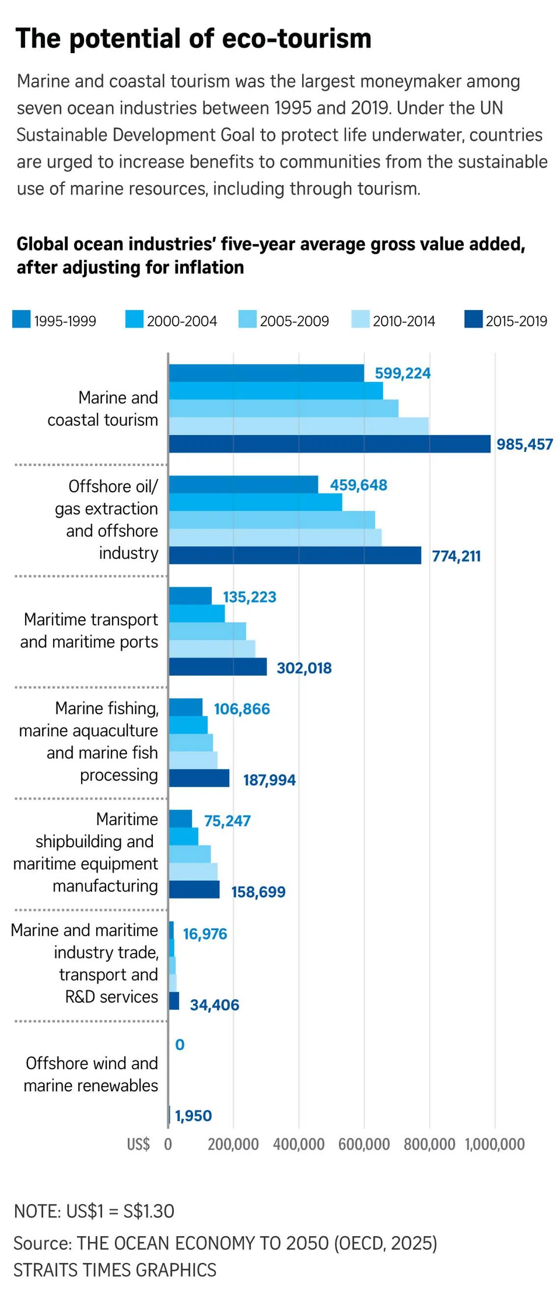 The ocean economy – which also includes the maritime, energy, aquaculture and fisheries sectors, among others – doubled in real terms from US$1.3 trillion (S$1.68 trillion) of gross value added in 1995 to US$2.6 trillion in 2020. That would make the ocean the world’s fifth-largest economy in 2019, if it were a country.