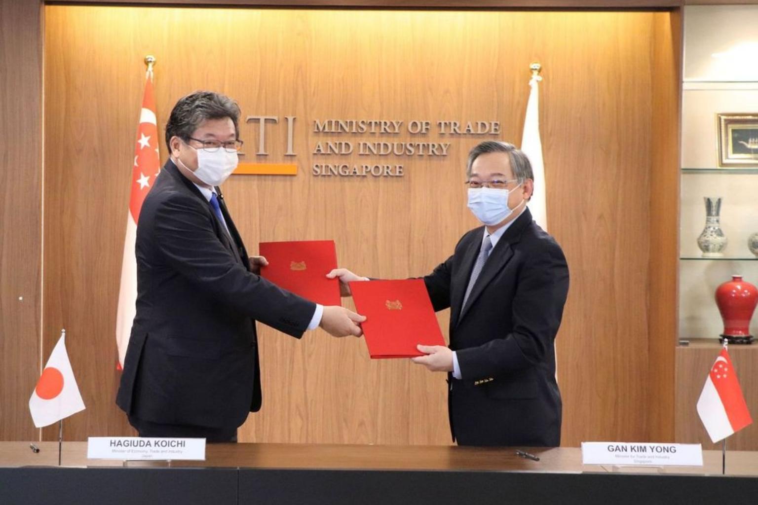 Minister for Trade and Industry Gan Kim Yong (right) and Japan's Minister for Economy, Trade and Industry Hagiuda Koichi signed a memorandum of cooperation on Jan 12, 2022.