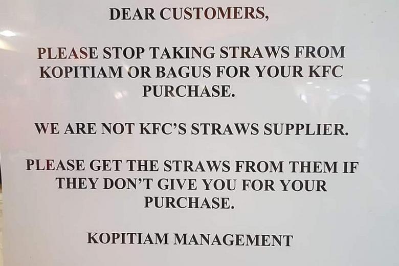 The sign telling KFC customers to stop taking straws from Bagus and Kopitiam foodcourts at Greenridge Shopping Centre went up last week. It has since been taken down.