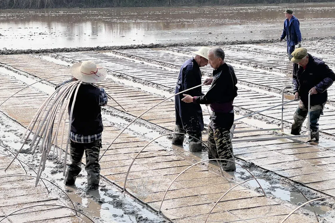 Farmers working in a paddy field in south-west China after crushed volcanic rock was scattered over it.