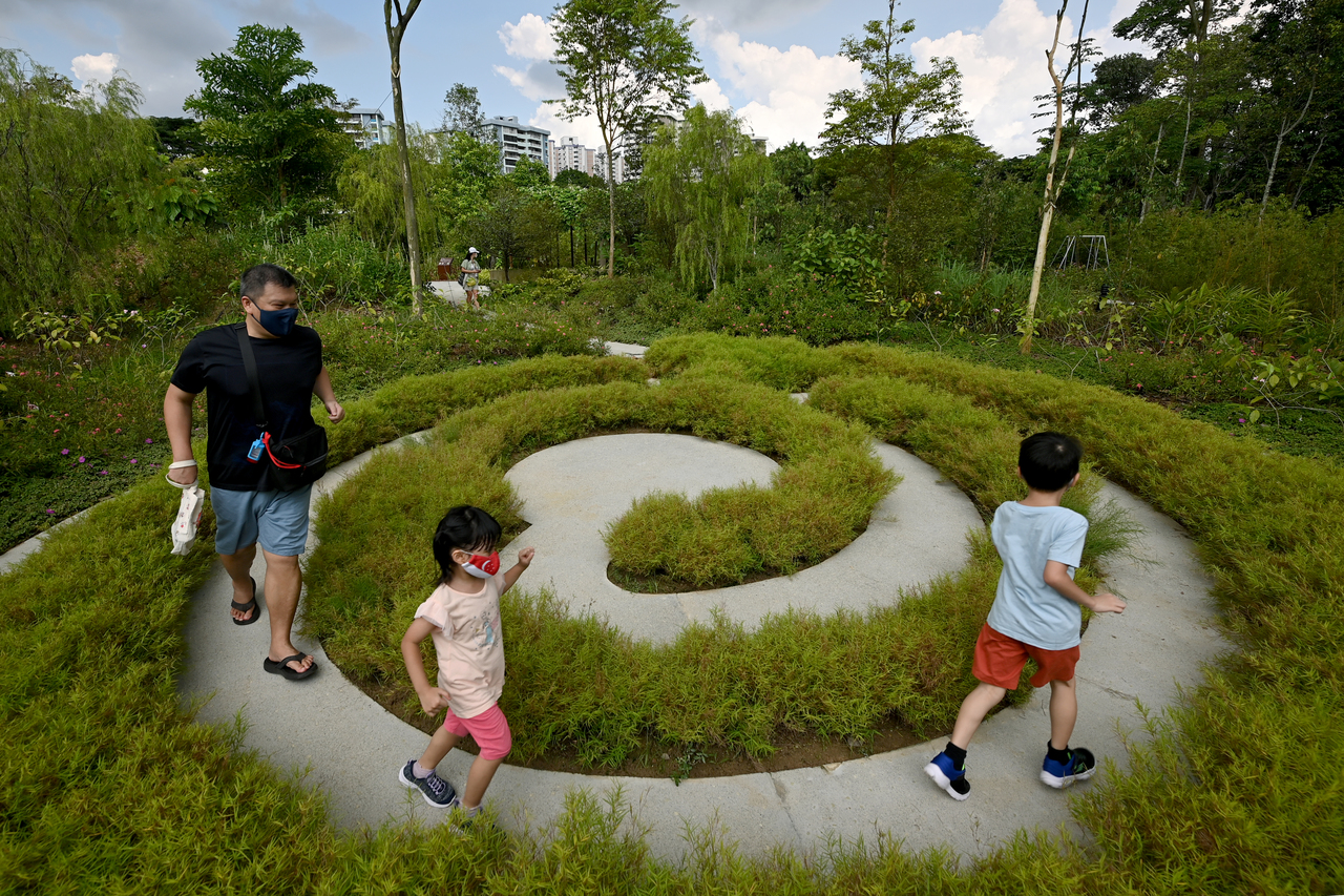 Mr Ong Kian Lee and his children exploring the labyrinth in the children’s discovery area of the therapeutic garden.