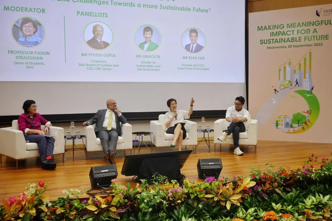 Minister for Sustainability and the Environment Grace Fu (second from right) speaking on the panel at the SMU Sustainability Forum on Sept 20. The panel, moderated by Professor Paulin Straughan (left), also included SMU chairman Piyush Gupta (second from left) and Insect Feed Technologies CEO Sean Tan.