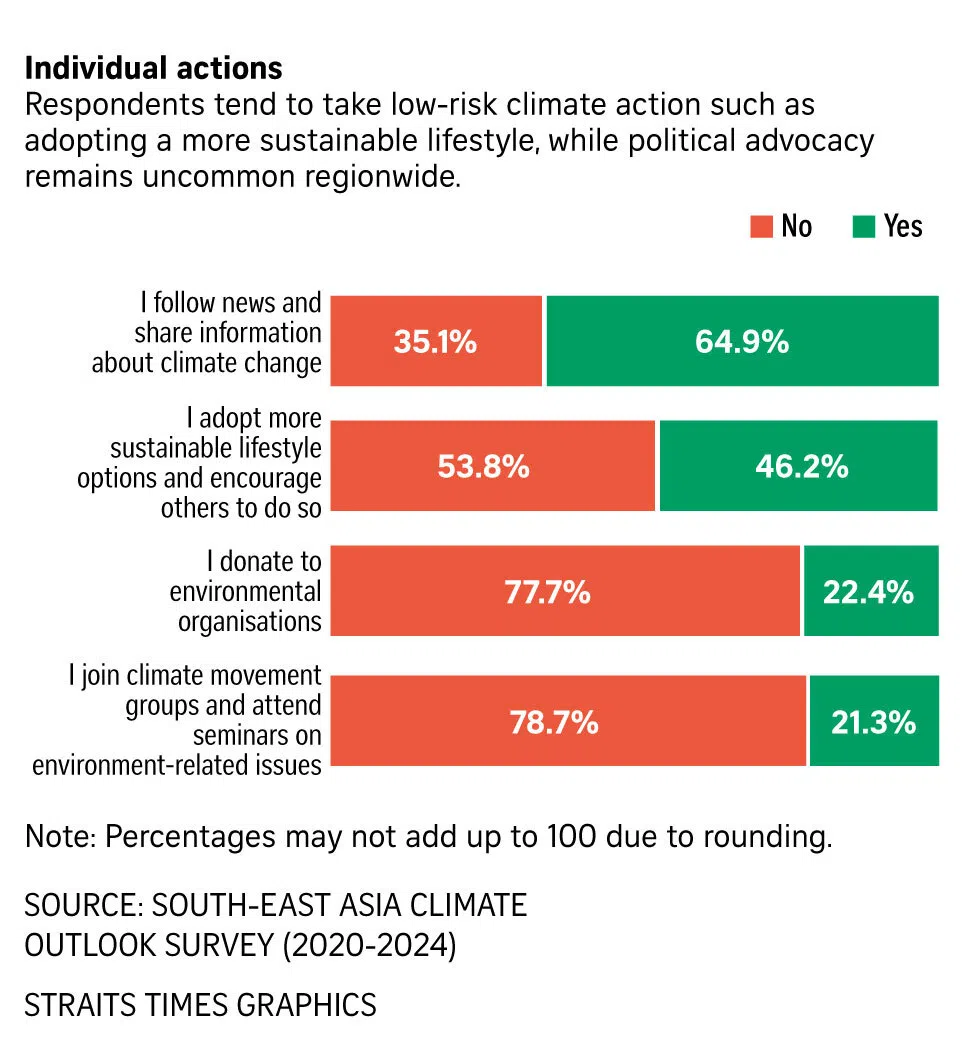 SINGAPORE - People in South-east Asia appear generally supportive of climate action, but think that measures that could result in higher costs of living should be pushed back, a new report released on Nov 28 found.