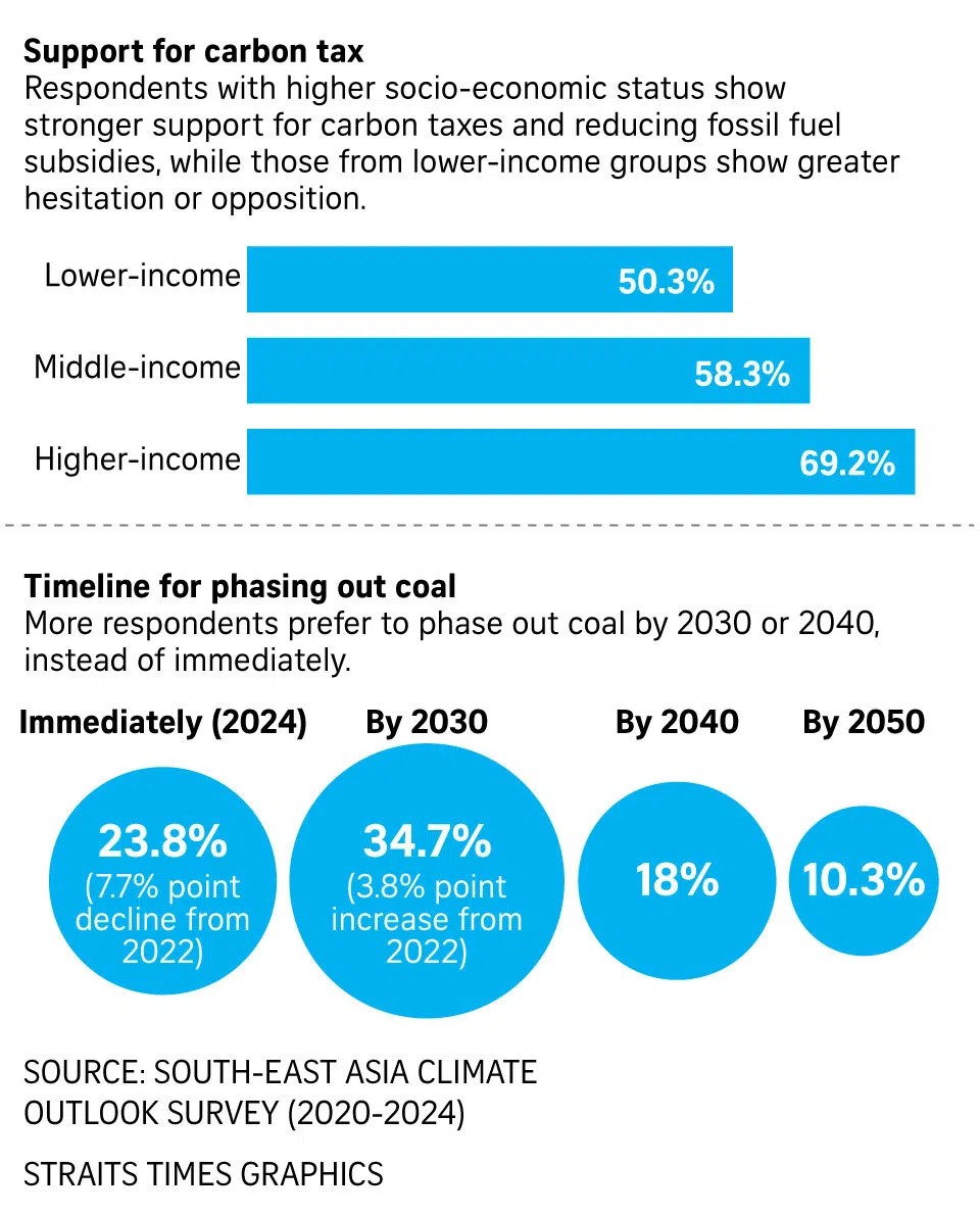 The report by Singapore researchers also found that those from lower income groups in the region were also more hesitant about carbon taxes and the reduction of fossil fuel subsidies in their countries, as they worry about higher energy prices.