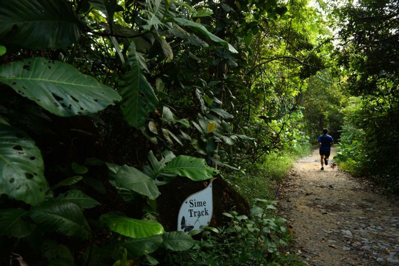 A jogger running along the Sime Track in the Central Catchment Nature Reserve.