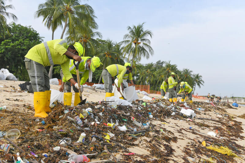 Rubbish collectors picking up debris at East Coast park on July 31, 2020.