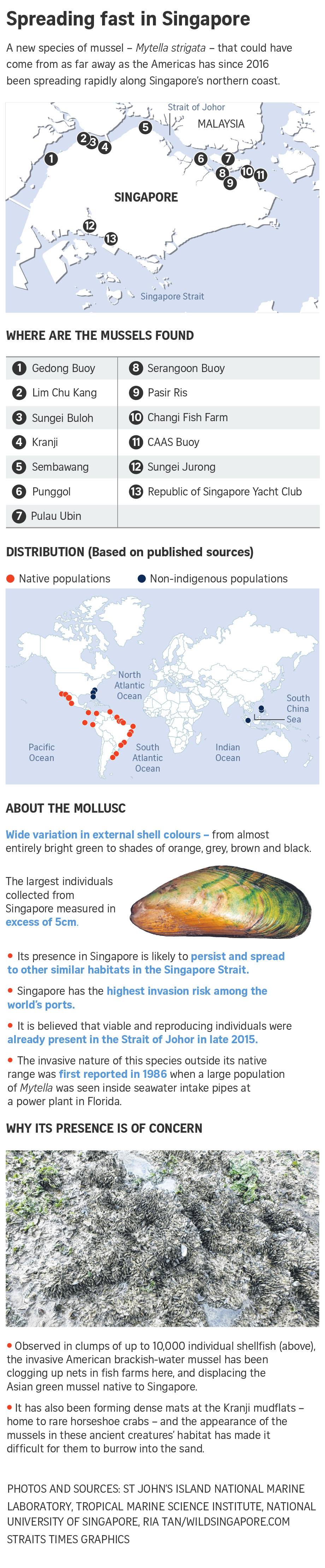 Since 2016, a new species of mussel that could have come from as far away as the Americas has been spreading rapidly along Singapore's northern coast, clogging up nets in fish farms and displacing the Asian green mussel native to Singapore, as they compete with the local molluscs for space.