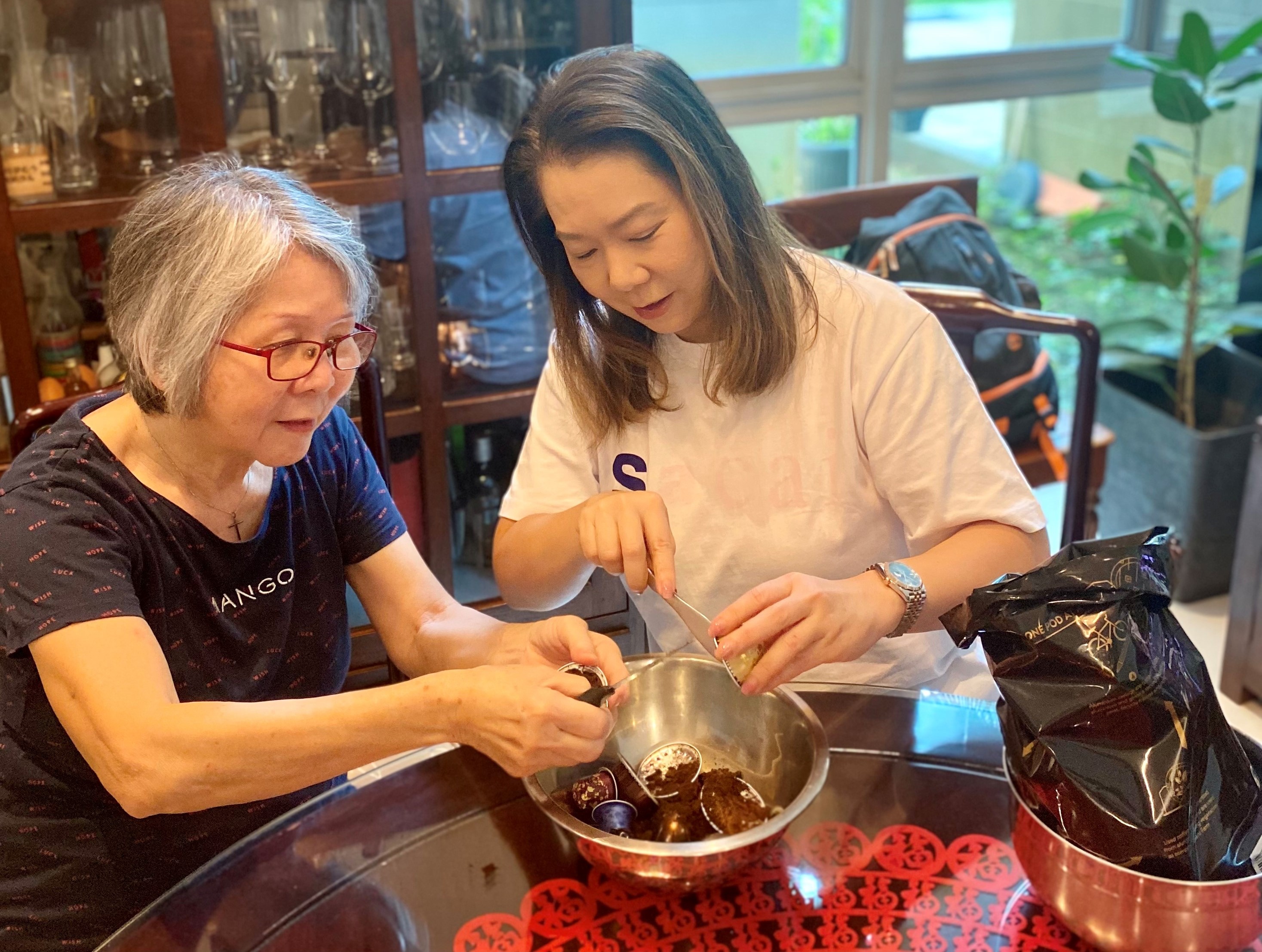 Ms Jennifer Yong (right) and her mother compost the few food scraps that cannot be repurposed, such as coffee grounds. PHOTO: JENNIFER YONG