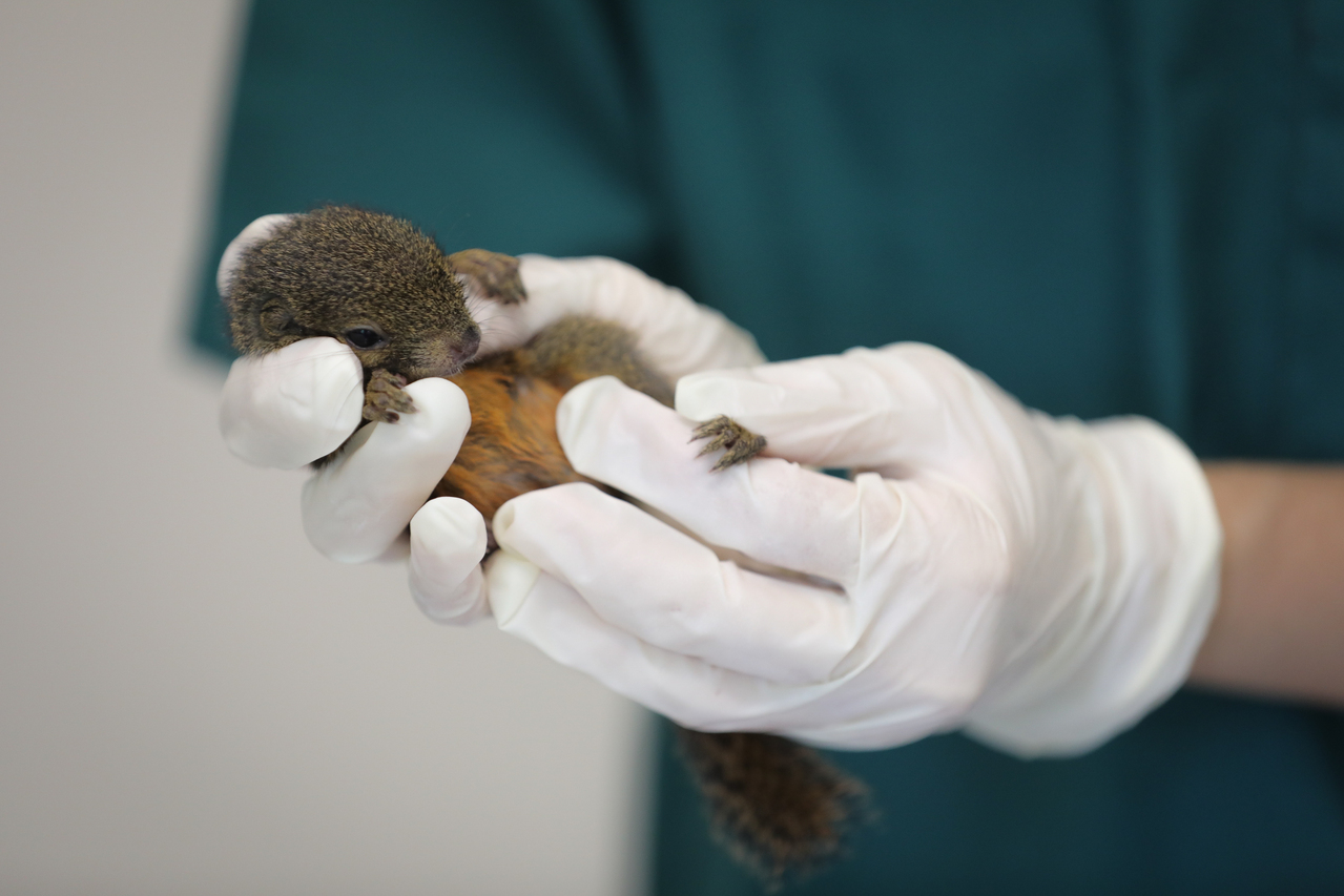A Juvenile Plantain Squirrel is being examined by a Veterinarian.