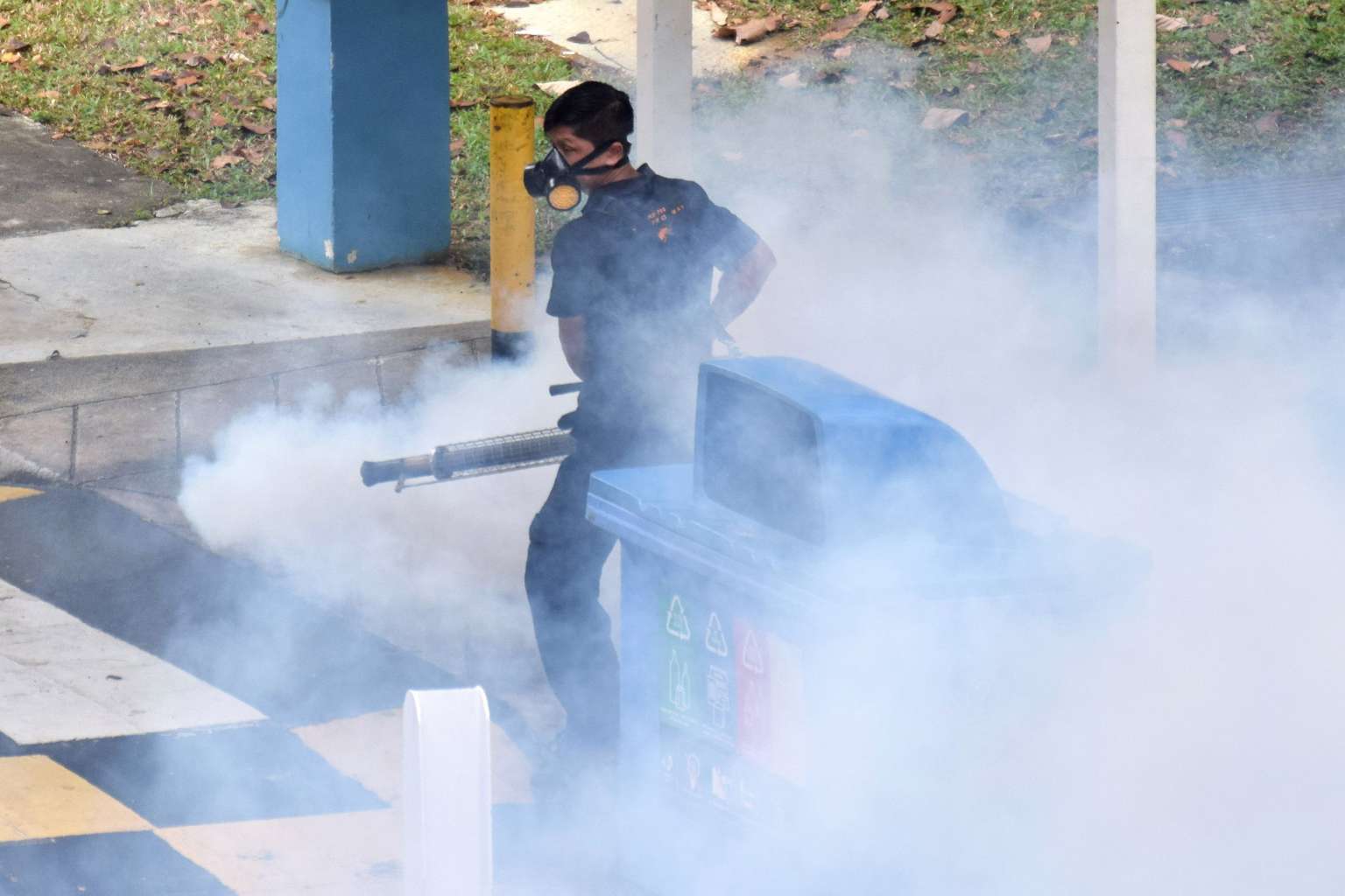 A worker fumigating an area at a residential estate in Singapore on April 5, 2016.