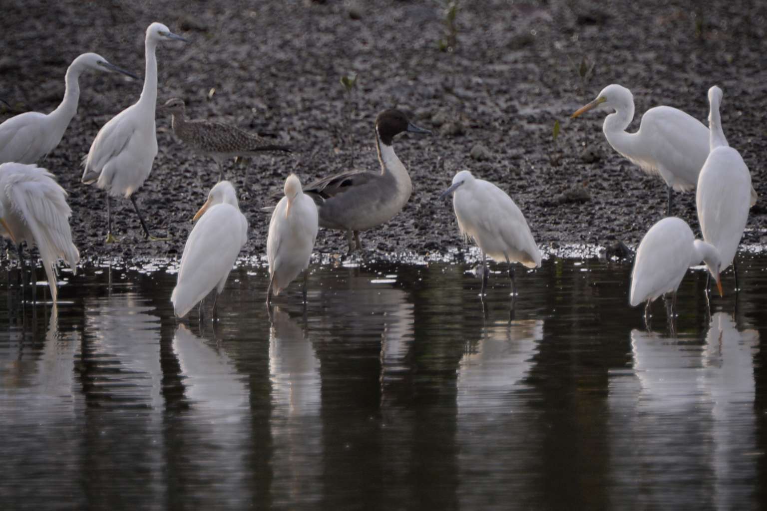 A Northern Pintail duck (centre) is seen among a group of egrets at the Sungei Buloh Wetland Reserve on Feb 3, 2016.